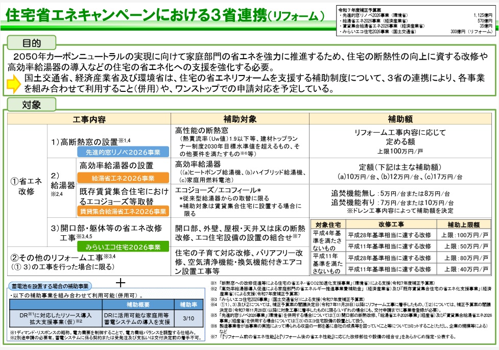 ここ3ヵ年計画で推進されてきた国土交通省、経済産業省、環境省3省連携の住宅省エネキャンペーンですが、2025年でいったん終了と思いきや、2026年も継続されることが閣議決定されました。